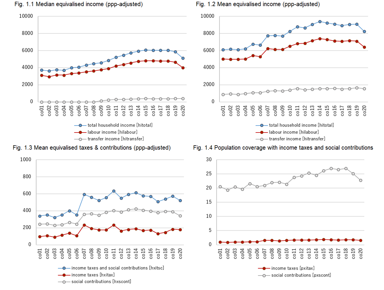 Let us proceed with describing the main restriction in creating comparable data files according to the LIS framework for income. In both surveys, wages and wage-like income from self-employment professions are collected before deduction of taxes and contributions withheld at source – possibly because of the strong labour market connotation of the survey and hence the interest for gross earnings. On the other hand, pension incomes (which are presumably the only other regular income on which withholding deductions may apply) are asked net, hence after such deductions, which are also not available separately. This creates a mix of net and gross income amounts when trying to aggregate the different subcomponents of income into a measure of total household income, whereby neither total gross household income, nor disposable household income are easily obtainable.