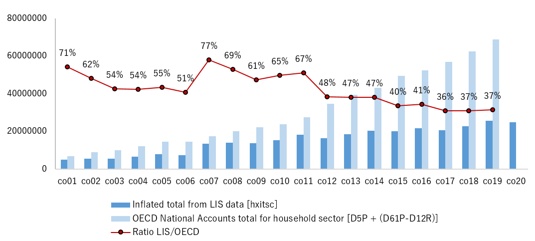 Note: More detailed coverage rates for all income subcomponents (not shown here) show that coverage rates range from about 60% for wages to 50% for social benefits, to about 40% for other incomes: the comparison to National Accounts points to a substantial underestimation of the households incomes, possibly deriving from the large informal sector existing in the country.