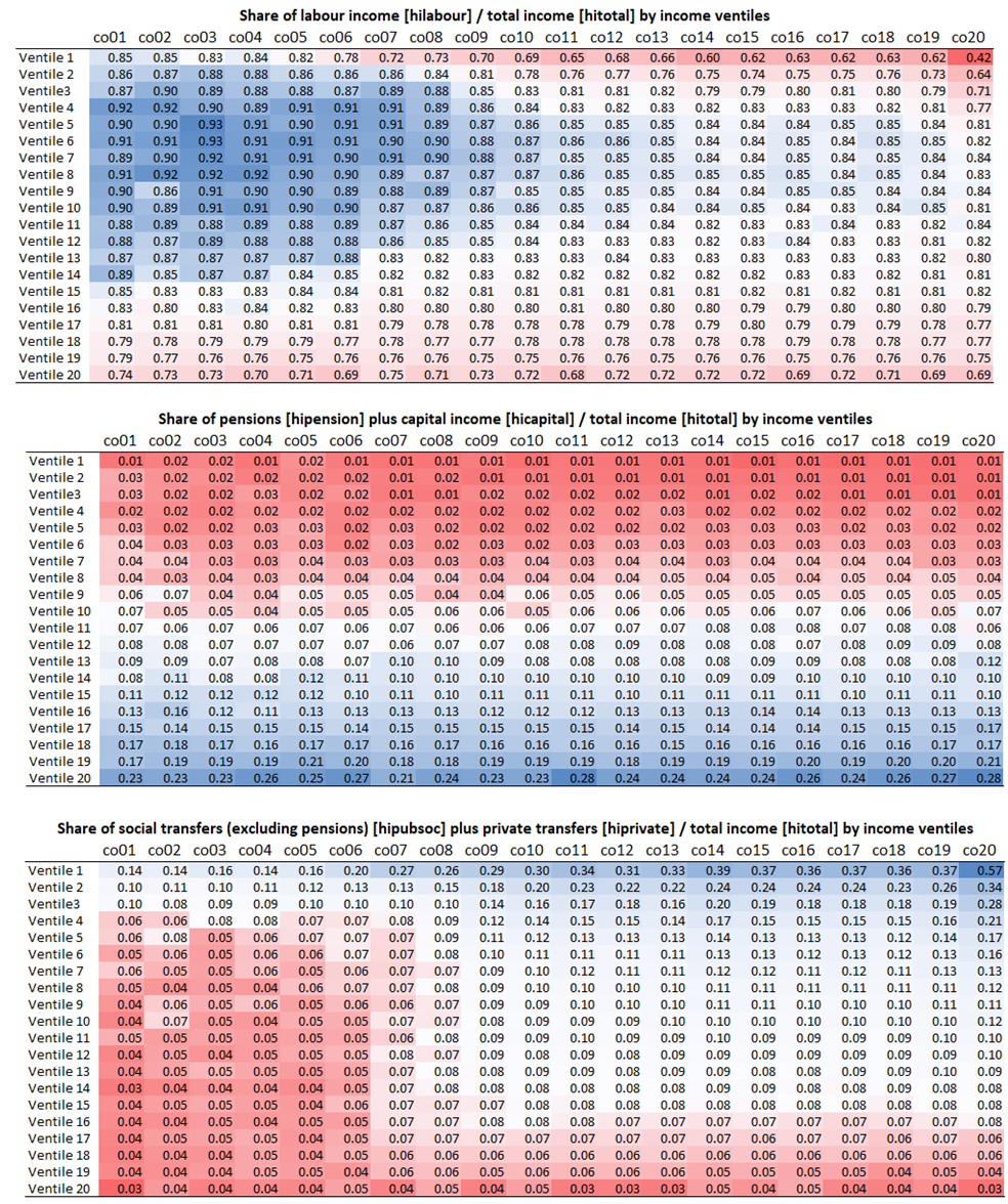 In order to better understand the pattern of the high level of inequality in Colombia, we conclude the article with an analysis of the way in which three major income subcomponents (earnings, retirement pensions and capital income, and other income) are distributed across the population. Fig. 3 shows the share of each of these subcomponents for each of the 20 ventiles of the total disposable income distribution and for each year, where the blue cells mark the ventiles with the highest income shares, and the red ones the lowest ones.