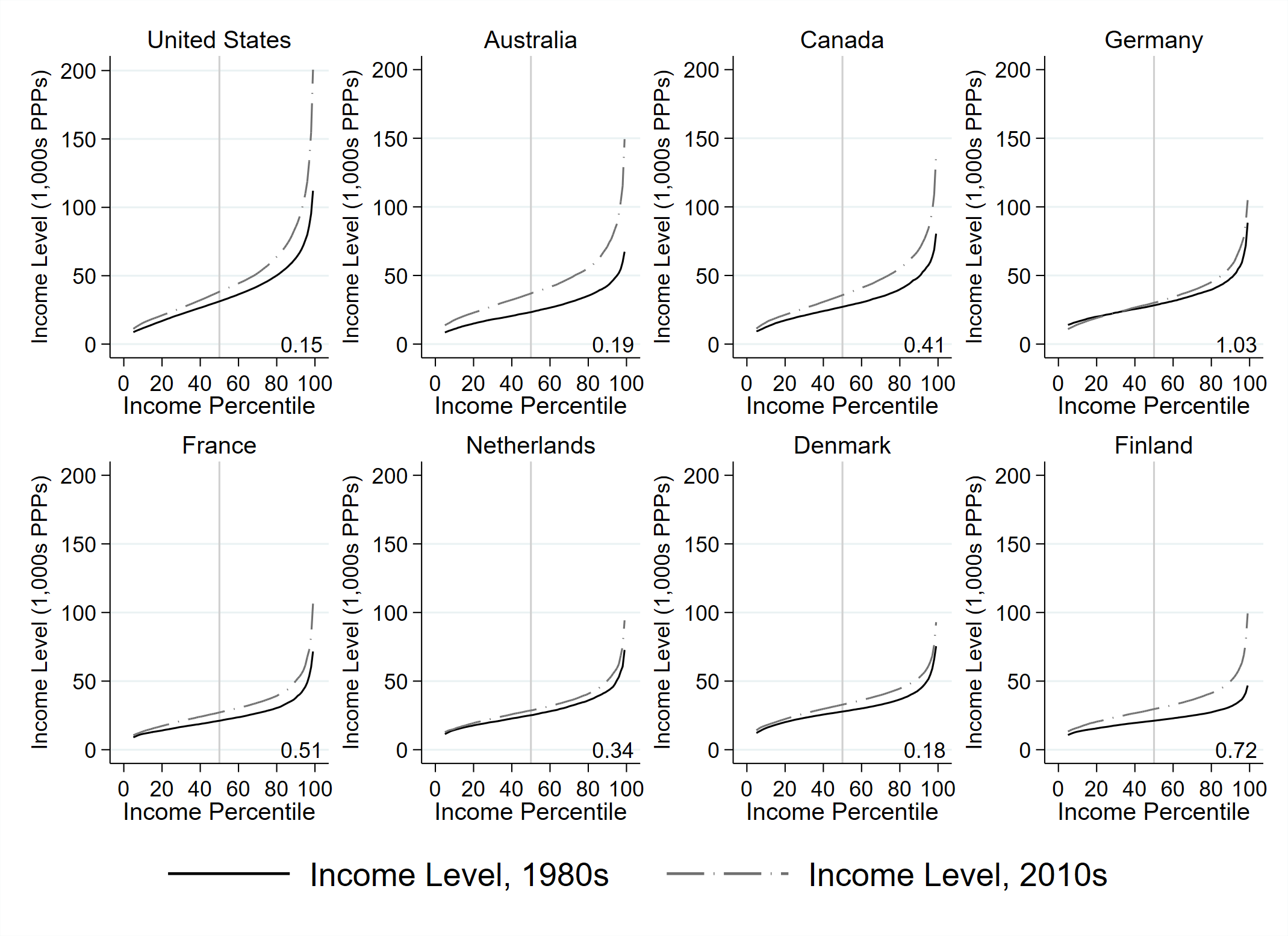 Fourth, and last, our findings suggest that changes in other factors including market institutions have generally promoted non-inclusive income growth, but with large variation by country. These ‘other factors’ include everything from changes in wage-setting institutions (such as changes to minimum wages or the strength or organized labor) to the influence of unmeasured characteristics in our models. In the United States, the non-inclusive effect of other factors, particularly at the top of the income distribution, is consistent with skill-biased technological change perspectives of rising returns to educational attainment. In countries that have generally maintained high levels of union membership and collective bargaining coverage, such as France, changes in other factors did not contribute to similar increases in inequality. We find, for example, that if the United States or Finland had experienced the same effect of changes in other factors as France, they both would have seen much lower income growth at the very top of their distributions. Similarly, our results suggest countries such as the United States and Finland could have adopted the tax policy changes of the Dutch, the transfer policy changes of the Danish, or followed a number of other pathways to achieve more inclusive income growth than observed.