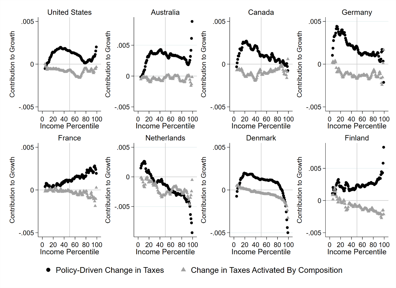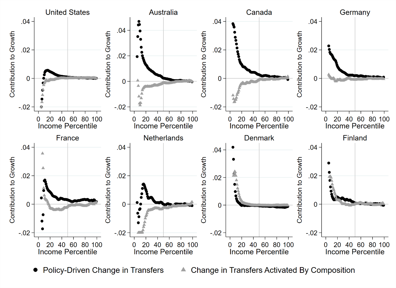 Figure 2 documents the contribution of policy-driven changes to transfers to income growth across the distribution in each country (the black circles). The gray triangles depict how compositional changes – such as higher or lower employment rates across time – influence changes in the level of transfers provided to a certain part of the income distribution.