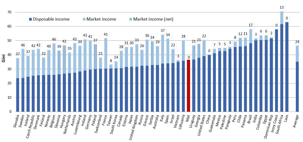 Note:Market income is defined as the sum of labour income, capital income, occupational and private pensions and private transfers. The number at the top of the bar represents the percent reduction of Gini after redistribution of public transfers and taxes. Countries denoted Maket Income (net) are countries where only net incomes are available (so that redistribution includes transfers only); Mali belongs to that group.