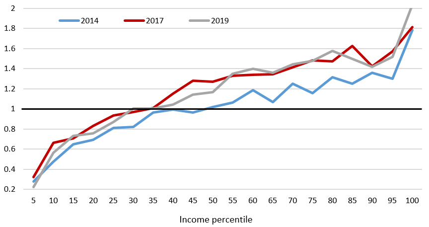 To get a better sense of the evolution and the shape of inequality in Mali, we report the main findings of the in-depth analysis which has emerged during the collaboration with AFD, INSTAT and LIS (see Alkemade et al, 2021). Our analysis points to three main findings. The first one is linked to the recent evolution of inequality in Mali. While the country is often presented as one with a relatively low and stable inequality, we see a noticeable uptick in inequality since 2017, with the Gini coefficient based on per capita income reaching 40 (and exceeding 50 for individual incomes). The second finding is the specificity of inequality patterns in Mali. On the one hand, contrary to empirical results for other countries, we do not see any significant difference between income and consumption inequality when measured with the Gini coefficient. Albeit the high poverty rate (the national absolute poverty rate is estimated at 42.3% for 2019, see INSTAT 2020), we could expect that income would be more unequally distributed compared to consumption. Our results show that this hypothesis is true only for the extremes of the distribution and that the Gini coefficient, giving more weight to the middle of the distribution, mitigates the difference (see Fig. 2).