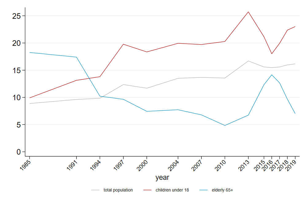Figure 1. Relative poverty rates for total population and age groups (1985-2019)