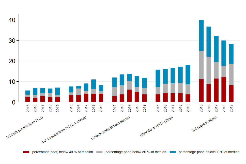 In a second step, we look at poverty rate by citizenship and immigration background, distinguishing between Luxembourgish, EU or EFTA 2 citizen and third country citizens. In case someone holds multiple citizenships, the citizenship of the resident country has priority. Furthermore, among Luxembourgish, we used the country of birth of the parents as a proxy for second generation immigrants and naturalised citizens and we distinguish between: Luxembourgish with both parents born in the country; with only one parent born in the country and the other abroad, and with both parents born abroad.