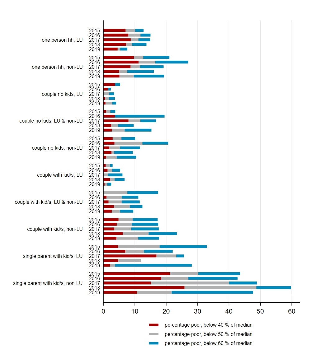 Indeed, poverty is on an increasing trend in the last decades, but is it increasing at the same pace for all? A STATEC report (that made also the news in the national media) from 2019, using, among other sources, the same original data that LIS has now harmonised, identifies as the most vulnerable groups to poverty the unemployed, the foreigners and the single parents. However, the unemployed group is problematic to adequately be captured in the survey of the resident population due to the large share of the cross-border work force. Thus, in this article we will focus on immigration background and different household types in order to identify the groups with high poverty rates and observe their evolution over the latest 5 years with the newly added data points in LIS database 2015-2019.