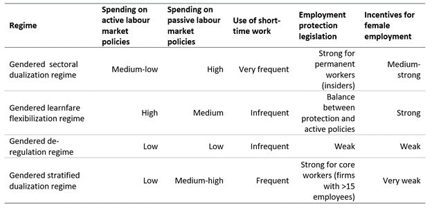 A new book offers a re-interpretation of labour market policy regimes from a gender perspective (Mulè and Rizza 2023). The study investigates the USA and the UK, as cases of the gendered liberal deregulation regime, Norway and Denmark as countries representative of the gendered learnfare flexibilization regime, Germany and the Netherlands with regard to the gendered sectoral dualization regime, and Italy and Spain as examples of the gendered stratified dualization regime. The features of these regimes are summarized in Table 1.