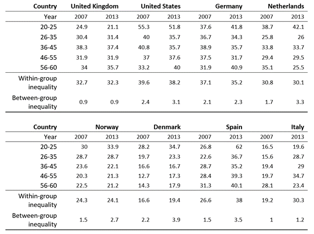 The decomposition analysis by age shows that inequality ‘between’ age groups increased in all countries except the UK, where it was stable (Table 2).