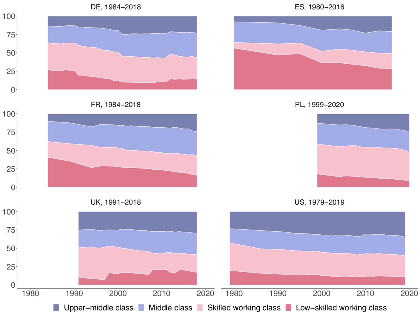 The corrosive effect of stagnating incomes on households is undisputed. However, we challenge the thesis of a middle class squeeze and argue instead that the great loser of the last four decades was not the middle class, but the people laboring below them, the working class. Our goal is to show empirically how different social classes fared between 1980 and 2020. We trace the evolution of employment and income by class in six large Western countries – France, Germany, Poland, Spain, the United Kingdom and the United States.