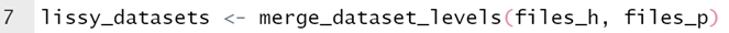A commonly performed computation using LIS data is to merge the household and person level files. This allows users to have all the household variables matched to individuals. ‘lissyrtools’ makes this task easy with ‘merge_dataset_levels()’. This function checks that the names of the files in both the household and person-level objects (‘files_h’ and ‘files_p’ in the example) are the same and then proceeds to iterate over them to merge them.