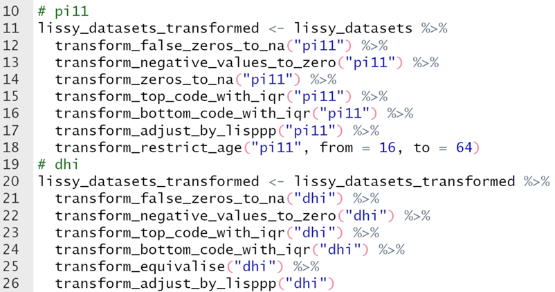 In the code below, we are performing the same data processing we would do to compute the LIS Gini estimates published in the DART dashboard for ‘wage income’ (‘pi11’) and ‘disposable household income’ (‘dhi’). In the case of ‘wage income’, this consists of: