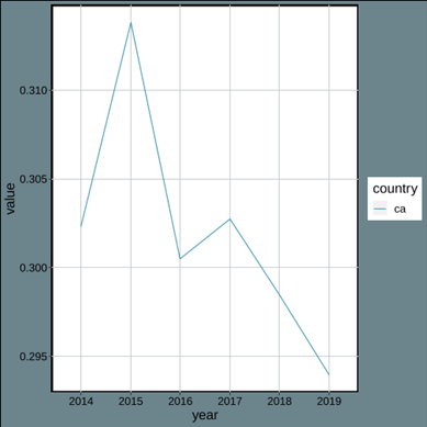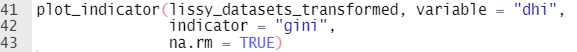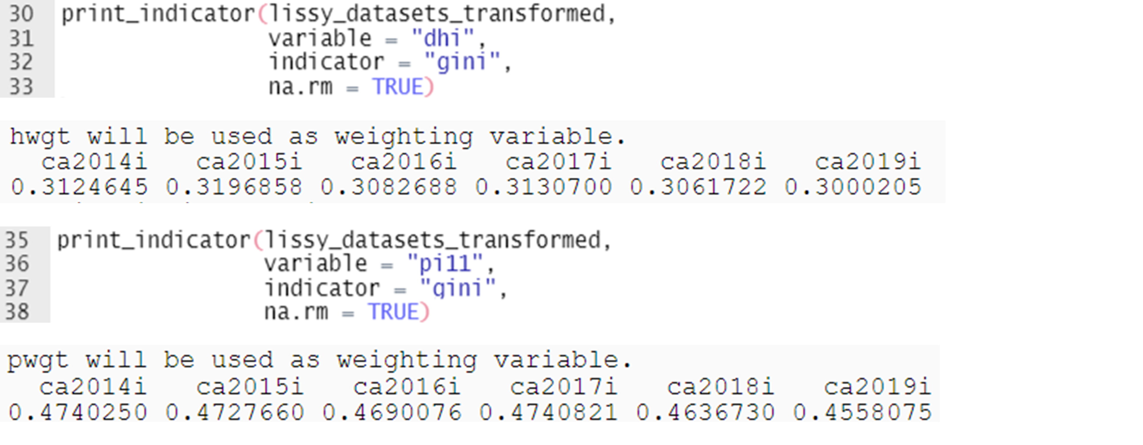 When we print the ‘gini’ of ‘dhi’, a message informs us that ‘hwgt’, the household-level weight, was used to weight the variable. This is because ‘lissyrtools’ recognizes ‘dhi’ as a household-level variable. If the variable name is not that of a standard variable, the function would have required an additional argument (‘variable_level’). Similarly, when computing an indicator for ‘pi11’, the function uses ‘pwgt’ instead of ‘hwgt’ as a weighting variable. The results of ‘print_indicator()’ are returned as a named vector, which can then be used for subsequent operations.