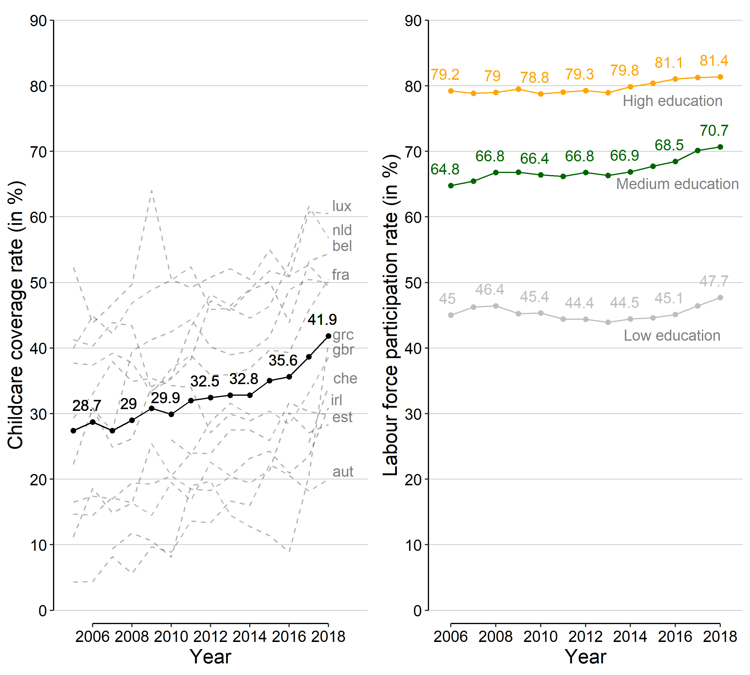 Figure 1: Left panel: Childcare coverage rate for children under the age of 3 years. Eurostat data between 2005 and 2018 for 13 countries (dashed lines). Yearly mean of childcare coverage for children under the age of 3 years. Indicator: tepsr_sp210 (Eurostat, 2023). Right panel: Labour force participation of mothers by education level and with at least one child under 14 years, yearly mean for the 13 used countries. OECD family database. LMF1.2 (OECD, 2023). Own calculations.