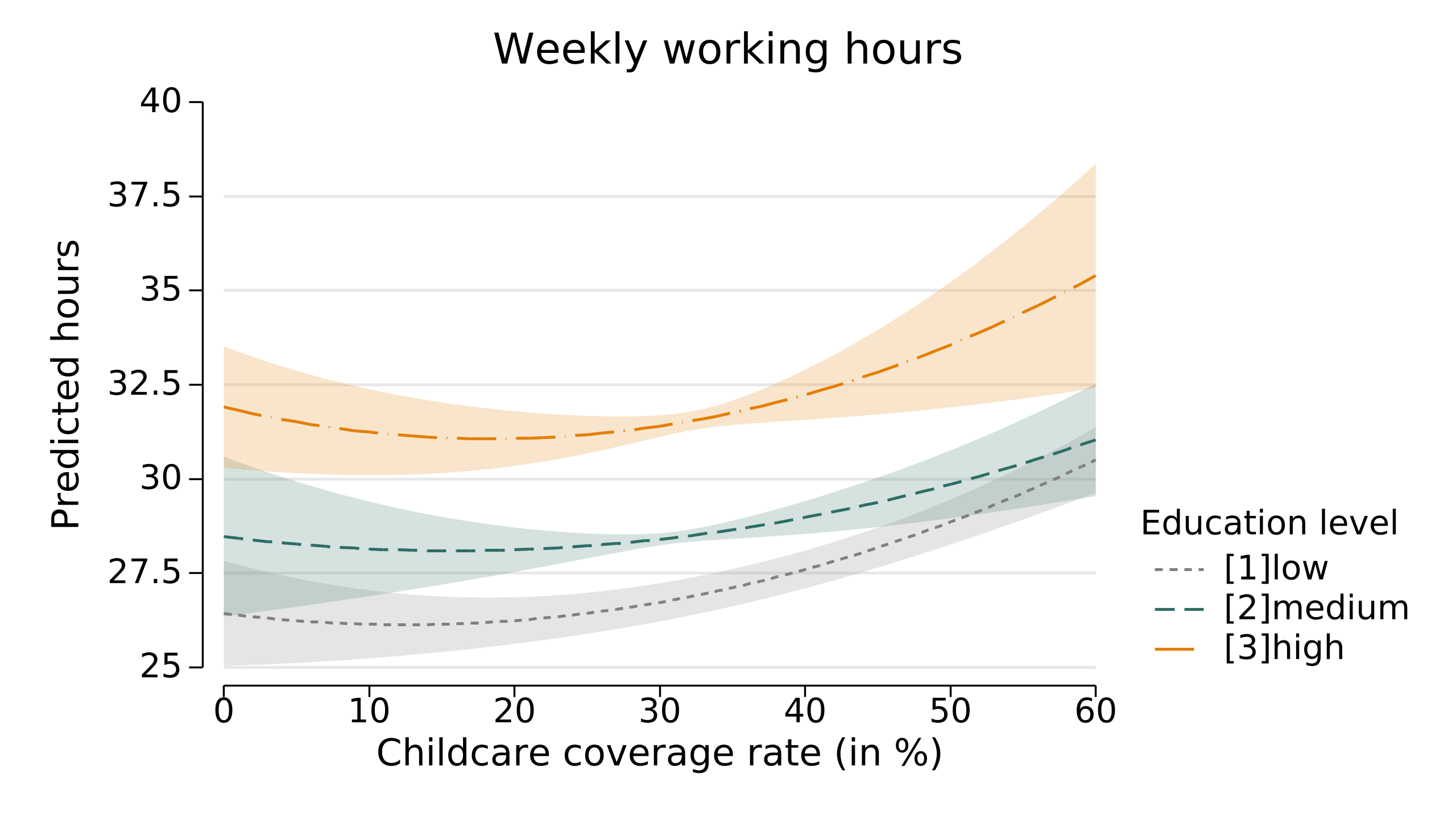 When comparing the level of working hours (see Figure 3), differences between the levels of education are also apparent. Highly educated women work the most, and without childcare, their weekly working hours are, on average, around 32 hours, increasing to just over 35 hours. Mothers with a medium level of education increase their working time by approximately 3 hours (from 28 to 31 hours) as the childcare coverage rate increases from 0 up to 60 per cent.