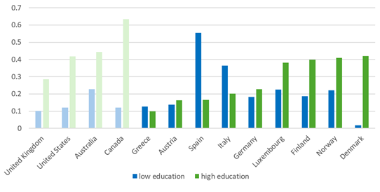 Interestingly, in countries with a generous student support system (regardless of the higher education finance system) we observe a similar fraction of single parents with high education – around 30% – 40%, with the distinction of Canada, where more than 60% of single parents are highly educated. It is worth noting that in Spain more than half of single parents have the lowest level of education, which is almost twice as many as in other countries.