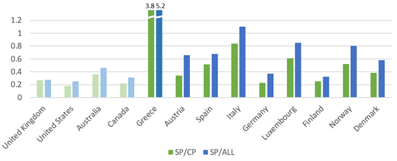 Turning to wealth levels, Table 1 presents the median wealth ratios for all household types (All), singles (S), single parents (SP), couples (C) and couple parents (CP). A number of noteworthy observations emerge from the data. Firstly, in most countries, apart from Italy, Finland and Norway, single parents consistently exhibit the lowest median net wealth compared to other household types. In Italy, Finland and Norway singles have the lowest median wealth. Secondly, the highest median wealth for all household types is observed in Luxembourg, Australia and the United Kingdom, whereas the lowest median net wealth is observed in the US, Greece, Austria, Germany, Finland and Denmark (below 100,000 USD). Thirdly, in almost all countries, the wealthiest household type are couples (apart from Greece). Couples have at least 1.7 times more net wealth (for Italy) and even 10 times more (UK, US, Austria, Germany and Finland) than single parents. Couples with children have higher median wealth than singles and single-parents but not more than couples (with the distinction of Greece, where couples with children poses the highest amount of net wealth).