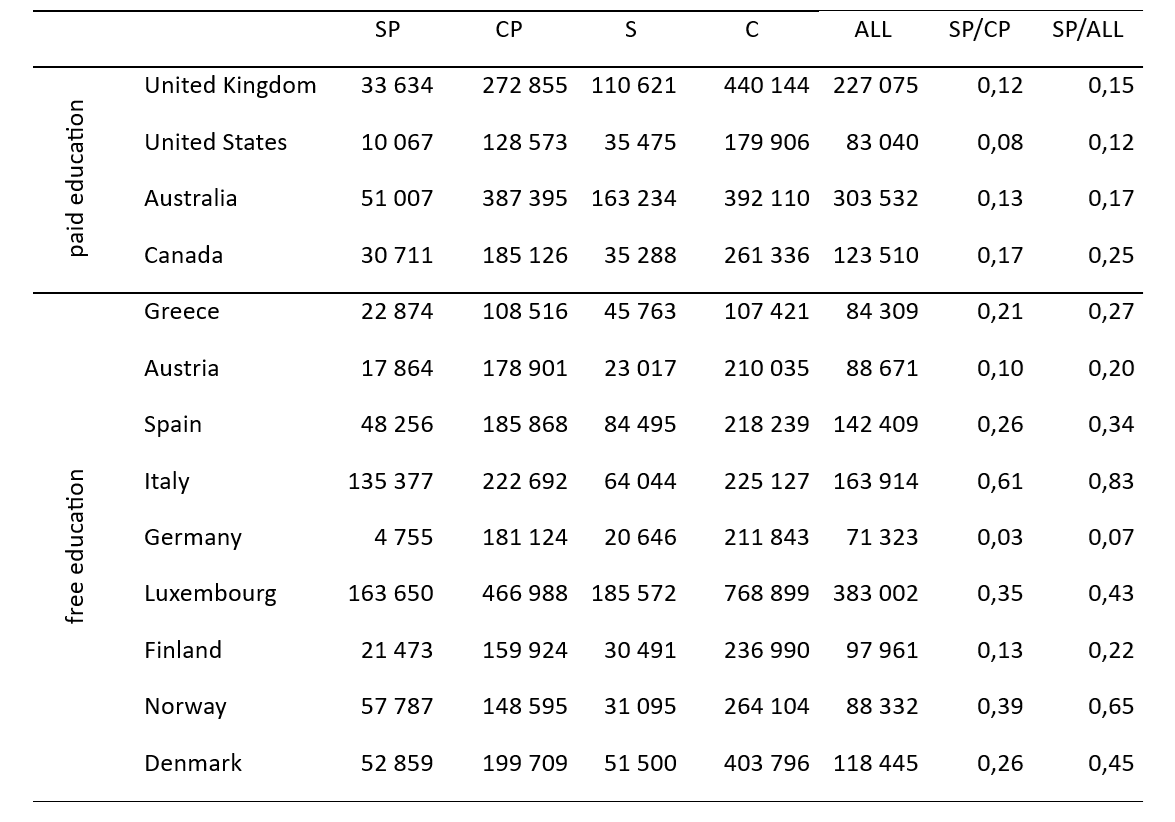 Notes: Lighter bar colors indicate countries with a paid education finance system (the UK, Australia, the US, Canada). Darker bar colors represent countries with a free education finance system (Austria, Italy, Spain, Germany, Greece, Finland, Luxembourg, Norway and Denmark).