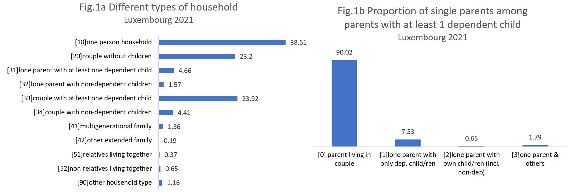 As shown in Figure 1.a, in Luxembourg the single-person households, are preponderant among the household types with 38.5%, followed by far, with more than 15 percentage points difference, by couples with at least one dependent child and couples without children.