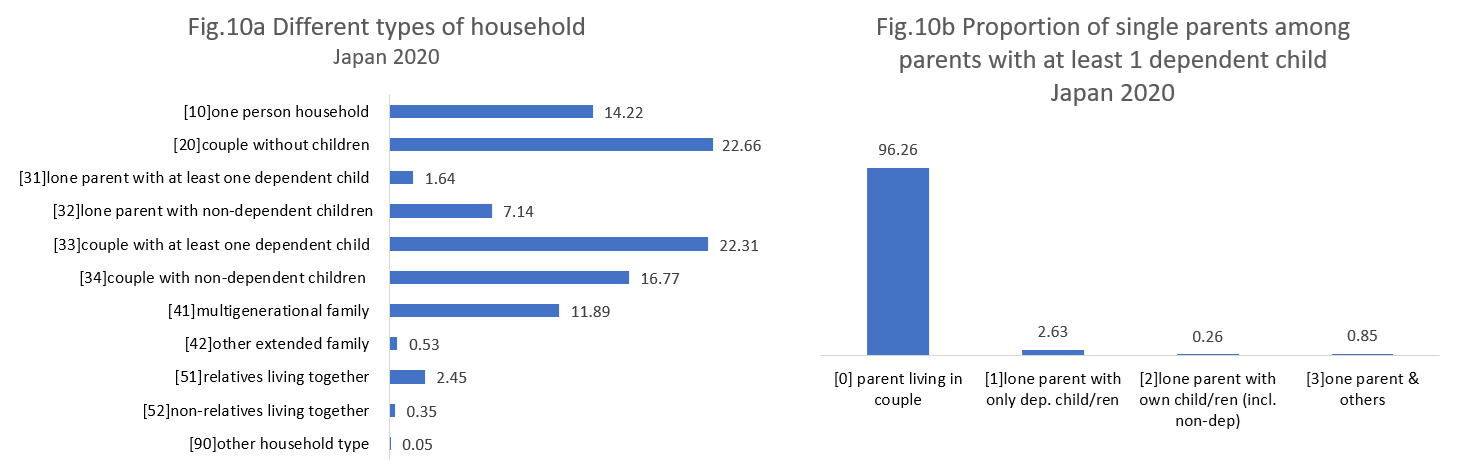 Japan is the only country in this selection where parents pointers are not available in the data. As a result, the individual-level graph in Figure 10.b. is limited to reference persons (and partners of parents in couples), meaning that the category of single parents living with other is most likely underestimated. Overall, Japan shows a relatively low proportion of single parents, under 4%, and most of them are lone parents living with only dependent children.