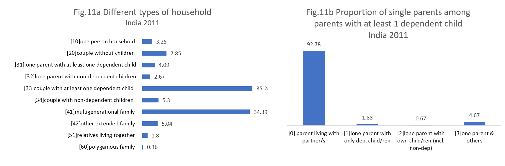 As seen in Figure 11.b, the proportion of single parents in India is relatively small, making up just slightly over 7% of all parents with dependent children. The majority of these single parents live with others in the household, which aligns with the significant presence of multigenerational families.