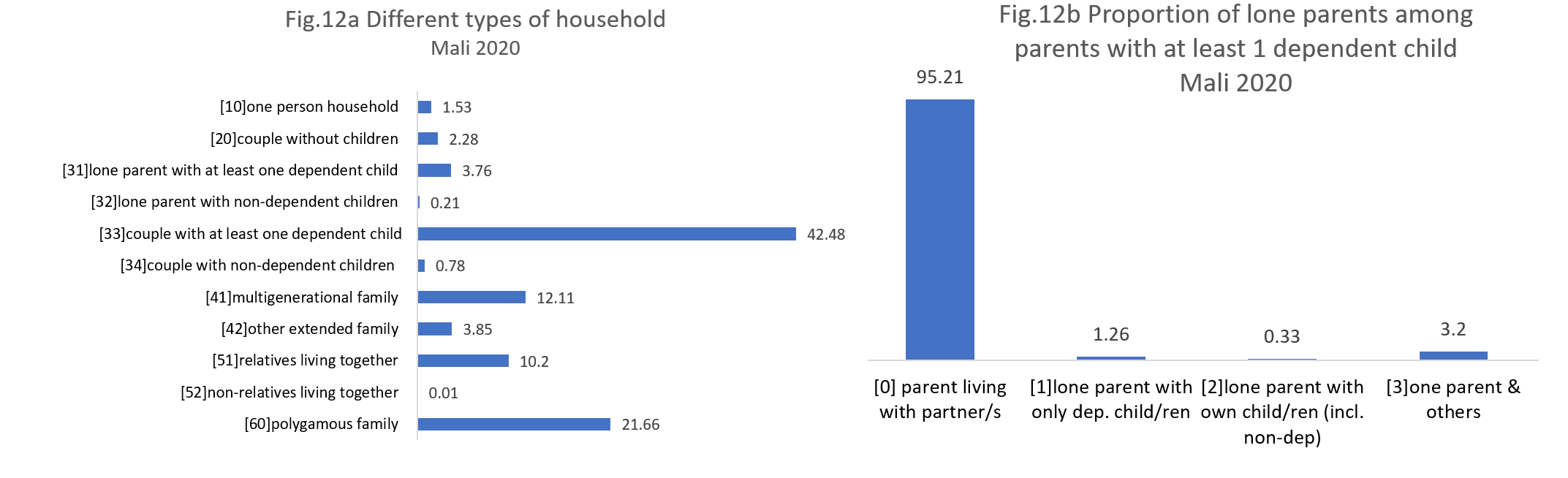Unlike India, Mali, the only African country in our selection, permits polygamy under the Marriage Code, allowing men to have up to four wives. Polygamy is so common in Mali that by the age of 45–49, nearly half of married women are in polygamous marriages (Heath, R., Hidrobo, M., Roy, S., 2020). While the most prevalent household type in Mali is couples with at least one dependent child, the polygamous families come in second, representing 21.66% of households, as shown in Figure 12.a. Moreover, the prevalence of polygamous unions is on the rise, with a 2.33 percentage point increase since 2011. Multigenerational families rank third, followed closely by households where relatives live together. The proportion of single parents among all parents in Mali is relatively low, under 5%, as shown in Figure 12.b, with the majority living with other individuals in the household.