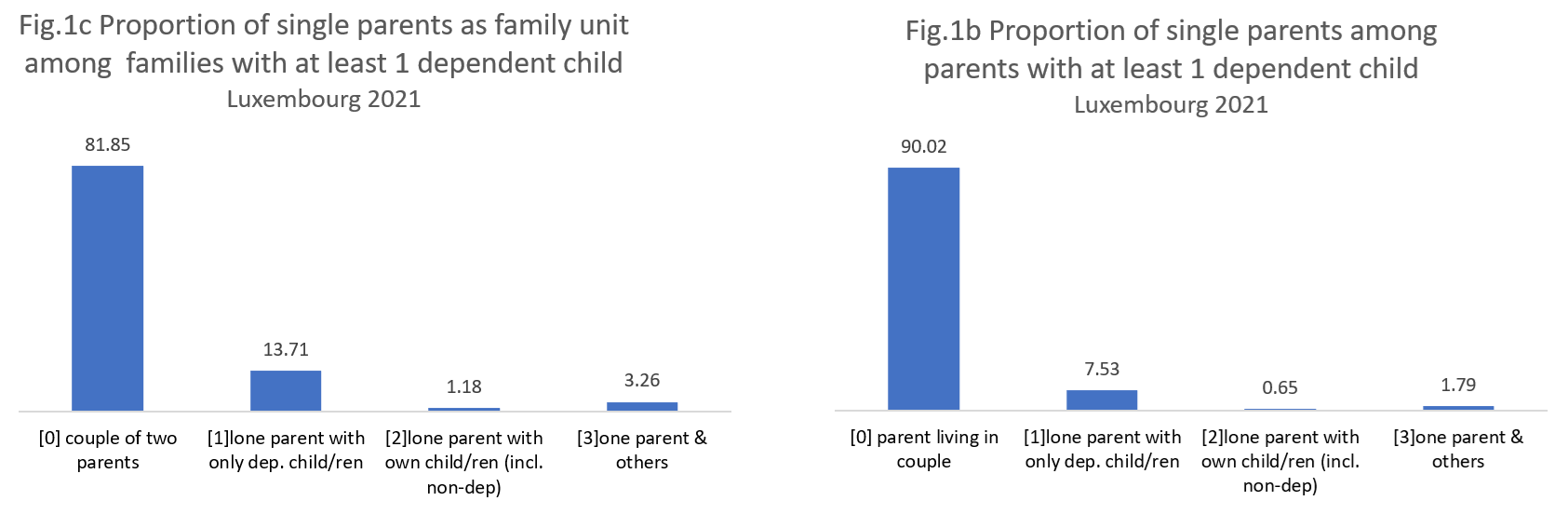 In Figure 1.b, when focusing on parents with dependent children, 7.5% are lone parents living only with their dependent children. Less than 2% of single parents live with others and even less live with non-dependent children as well. This can be explained by the fact that, on average, parents in Luxembourg have less than 2 children, therefore the cases of both dependent and non-dependent ones do not occur often.