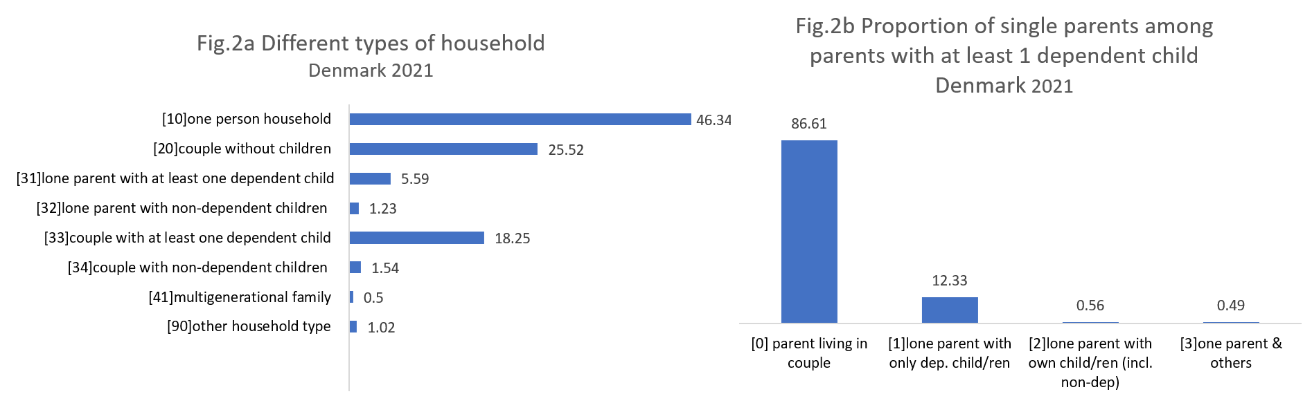 Figure 2.a reveals that in Denmark nearly half of all households are single-person households, the highest proportion among the countries featured in this article. A quarter of households consist of couples without children, followed at 7 percentage points difference by couples with at least one dependent child. As shown in Figure 2.b, Denmark has a higher percentage of single parents with dependent children compared to Luxembourg, with over 13% overall. The vast majority of them are lone parents living solely with their dependent children.