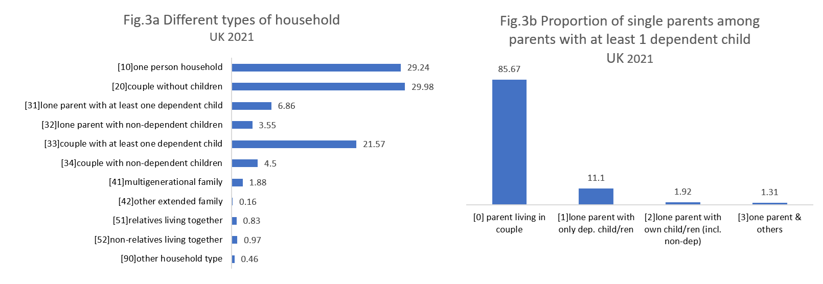 The UK is the only European country in our selection where single-person households are not the most common household type. Instead, couples without children occupy the largest share, though the difference between these two categories is small, as shown in Figure 3.a. Couples with at least one dependent child follow, with an 8 percentage point gap. When examining single parents, Figure 3.b shows that the UK has the highest proportion of single parents among the selected European countries. Most of them are lone parents living only with dependent children, but compared to the other countries, nearly 2% live with both dependent and non-dependent children, and a small number live with others.