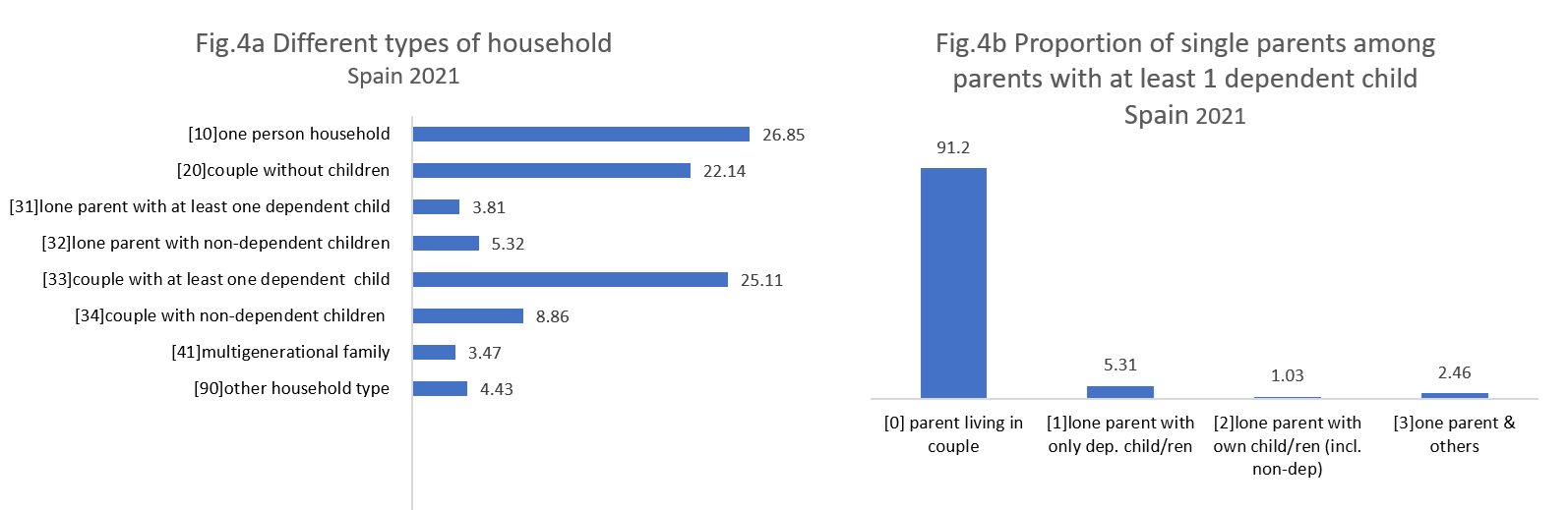 Spain, representing the Southern model, displays a distinct pattern of household types. While single-person households remain the most common, as shown in Figure 4.a, couples with at least one dependent child come in second, with a small difference of less than 2 percentage points. Couples without children follow, with a gap of around 3 percentage points. When examining parents with dependent children, Figure 4.b reveals that 5.3% are lone parents living only with dependent children. About 1% live with both dependent and non-dependent children, while nearly 2.5% live with others. Notably, as seen in Figure 4.a, the proportion of multigenerational families in Spain is higher than in the other countries previously discussed.