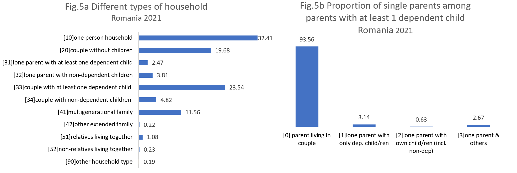 Romania, representing Eastern European countries, exhibits a distinct household typology pattern. Approximately a third of households are single-person households, followed by couples with at least one dependent child, which are about 9 percentage points less common. Couples without children are only slightly less prevalent than the ones with children, with a difference of less than 4 percentage points, as shown in Figure 5.a. A particularity in Romania is its highest proportion of multigenerational families compared to all other European countries presented, accounting for almost 12% of households. Romania also has the lowest share of single parents among the European countries discussed, representing only about 6.5% of parents with dependent children, as seen in Figure 5.b. Just over half of them are lone parents living only with dependent children, while the second largest group lives with others, a trend that is also reflected in the higher proportion of multigenerational families.