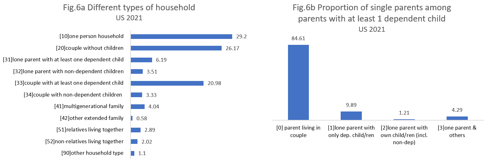 Looking at the household patterns around the world, the example from North America, the United States, presents a different scenario, as shown in Figure 6.a. Single-person households are the largest category, followed closely by couples without children, with a difference of less than 3 percentage points. Couples with at least one dependent child are about 5 percentage points less common than couples without children in the household. Lone parents rank fourth among household types with over 6%. This is supported by the individual level analysis: as shown in Figure 6.b, single parents represent over 15% of parents with dependent children. Most of them are lone parents living only with dependent children, while about 28% of single parents live with others.
