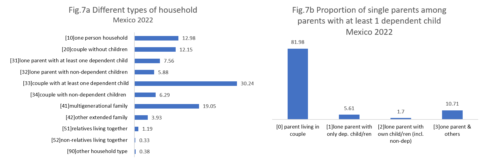 Mexico, representing Central America, presents a distinctly different household pattern compared to the previously discussed countries, as shown in Figure 7.a. The largest household type, making up over 30%, consists of couples with at least one dependent child, followed by multigenerational households, which account for over 19%, reflecting different cultural norms. Due to the underdeveloped pension system in Mexico, families rely heavily on intergenerational solidarity. Studies have shown that one in four adult children live with their elderly parents (Gomes, C., 2007). Single-person households rank third, with a gap of more than 3 percentage points, followed closely by couples without children. Lone parents represent the fifth largest household type, and as seen in Figure 7.b, the single parents account for about 18% of parents with dependent children. Notably, the majority of single parents, over 10%, live with others, showing a different pattern compared to the other countries discussed.