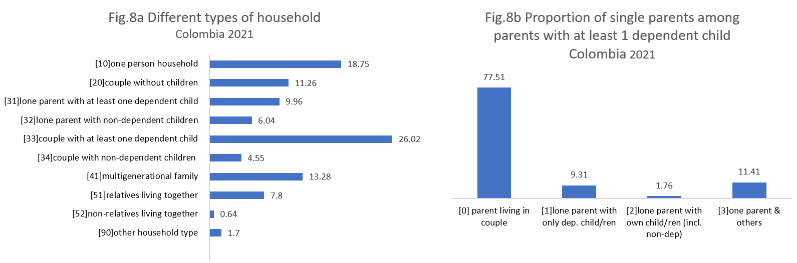 A similar pattern is observed in South America, in Colombia, as shown in Figure 8.b. The proportion of single parents among parents is even higher, at around 22.5%, with nearly half of them living with others in the household. This is supported by the fact that the multigenerational families represent the third largest household category, as is reflected in Figure 8.a. Single-person households rank second, with a difference of about 5.5 percentage points, while couples with at least one dependent child make up the largest household category, similar to the pattern in Mexico. Additionally, there is a significant proportion of households (nearly 8%) where relatives live together without a family nucleus.
