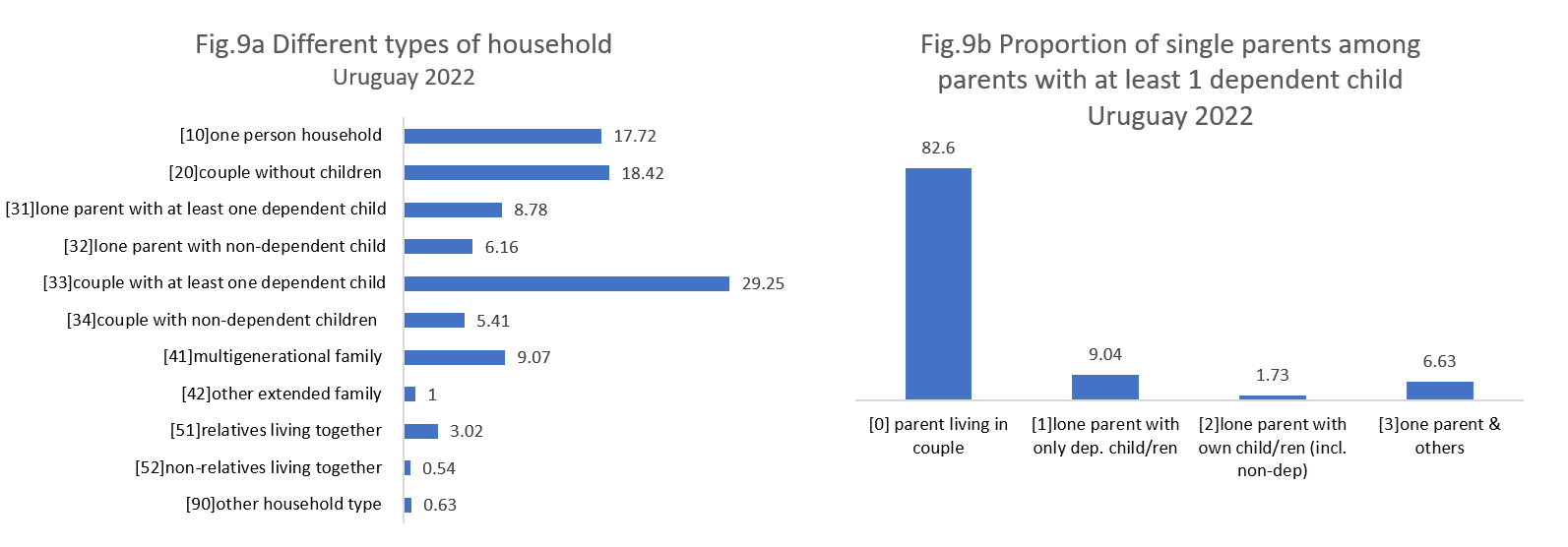 Uruguay, another South American country, exhibits a slightly different household pattern. The largest category is still couples with at least one dependent child, but the second largest, with a difference of more than 10 percentage points, consists of couples without children. Single-person households follow closely, as shown in Figure 9.a. Multigenerational families represent the fourth largest category, accounting for over 9%. Unlike in Colombia, however, the majority of single parents in Uruguay are lone parents living only with their dependent children, while about 38% of single parents live with others and only a small percentage with dependent and non-dependent children.