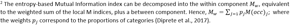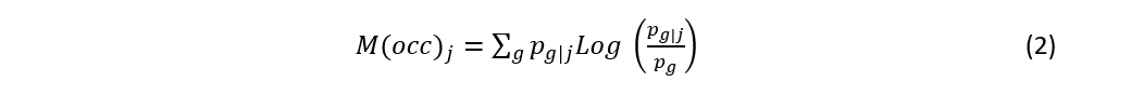 Equation 2 shows the local Mutual Information Index for each occupational group j. The conditional probability of an individual having graduated from the g educational level, given that the individual was recruited in the j occupational group is denoted by ??|?, and ?? denotes the unconditional probability of having graduated from the g educational level2. The local segregation index for occupations (M(occ)j) captures the recruitment process and wage setting based on the educational qualifications of workers. This helps us understand the degree of educational selectivity employers exhibit across various occupational groups. We do this within the context of educational expansion at different levels.