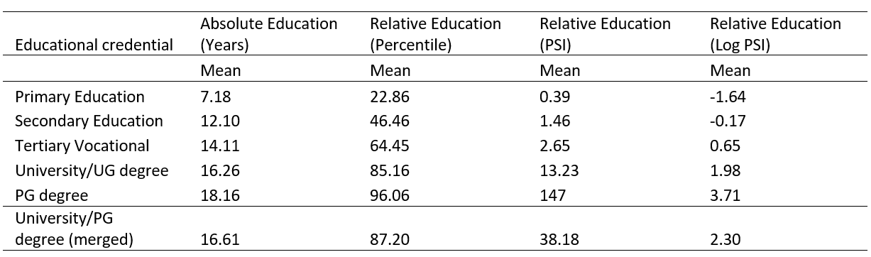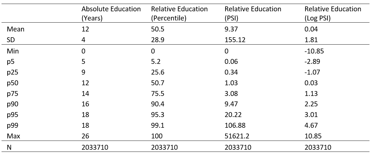 To approximate workers’ relative position in the educational attainment distribution to explain differences in returns to educational credentials, researchers have traditionally used a relative measure of education, operationalized as a rank-based indicator based on the percentile of years of formal schooling. Although this percentile provides valuable insights, it assumes that the relative positions of workers are equal at each point in the educational distribution (Tam, 2016). Instead, we used a positional status index (PSI) to capture the positional dimension of education. This is a monotonic transformation of years of education into a rank order measure that captures the “average number of competitors that were excluded” (ACE) (Tam 2007; 2016). The PSI index predicts rank-based inequality in returns to education, which reflects the competitive structure of the labor markets. The PSI orders workers from the sample in each country-year according to their relative positions at the educational level relative to others. We focus on workers aged 25–35 years, considering this group to be those who are entering or have recently entered the labor market in each country-year.