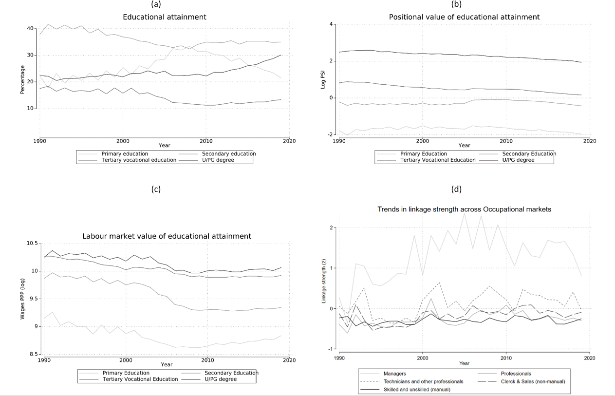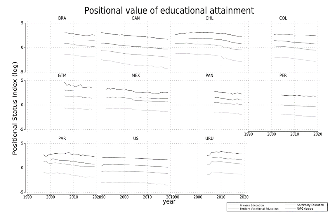 Figure 3. Trends in positional value of educational credentials by country 1990-2019