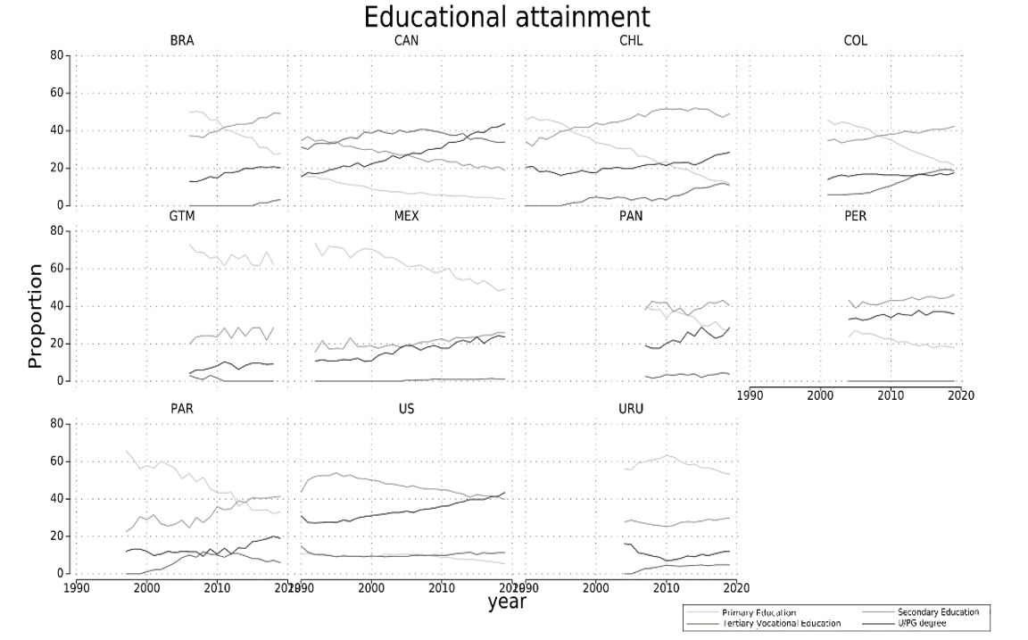 Figure 1 depicts the main trends in educational attainment, labor market value and structural link between educational levels and occupations in the Americas between 1990-2019 among new entrants to the labor market. Panel A portrays the share of educational attainment and Panel B the positional value of education (PSI). Panel C, in turn, shows the market value of educational attainment (log PSI), and Panel D the linkage strength across occupational groups.