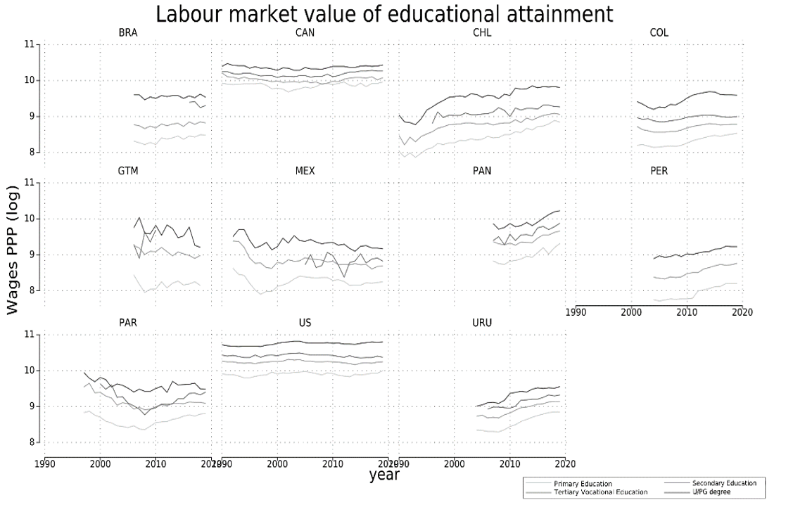 In this context, it is worth wondering what the association between educational attainment and wages would look like across the liberal pool of countries in the Americas. The weaker coordination between the deregulated labor markets and the educational institutions in this context may allow us to observe the variation in trends between educational expansion, returns to education in the labor markets, and the relative value of educational credentials.