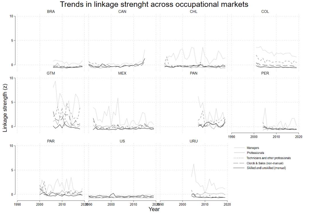 Figure 5. Trends in linkage of educational credentials across occupational groups by country 1990-2019