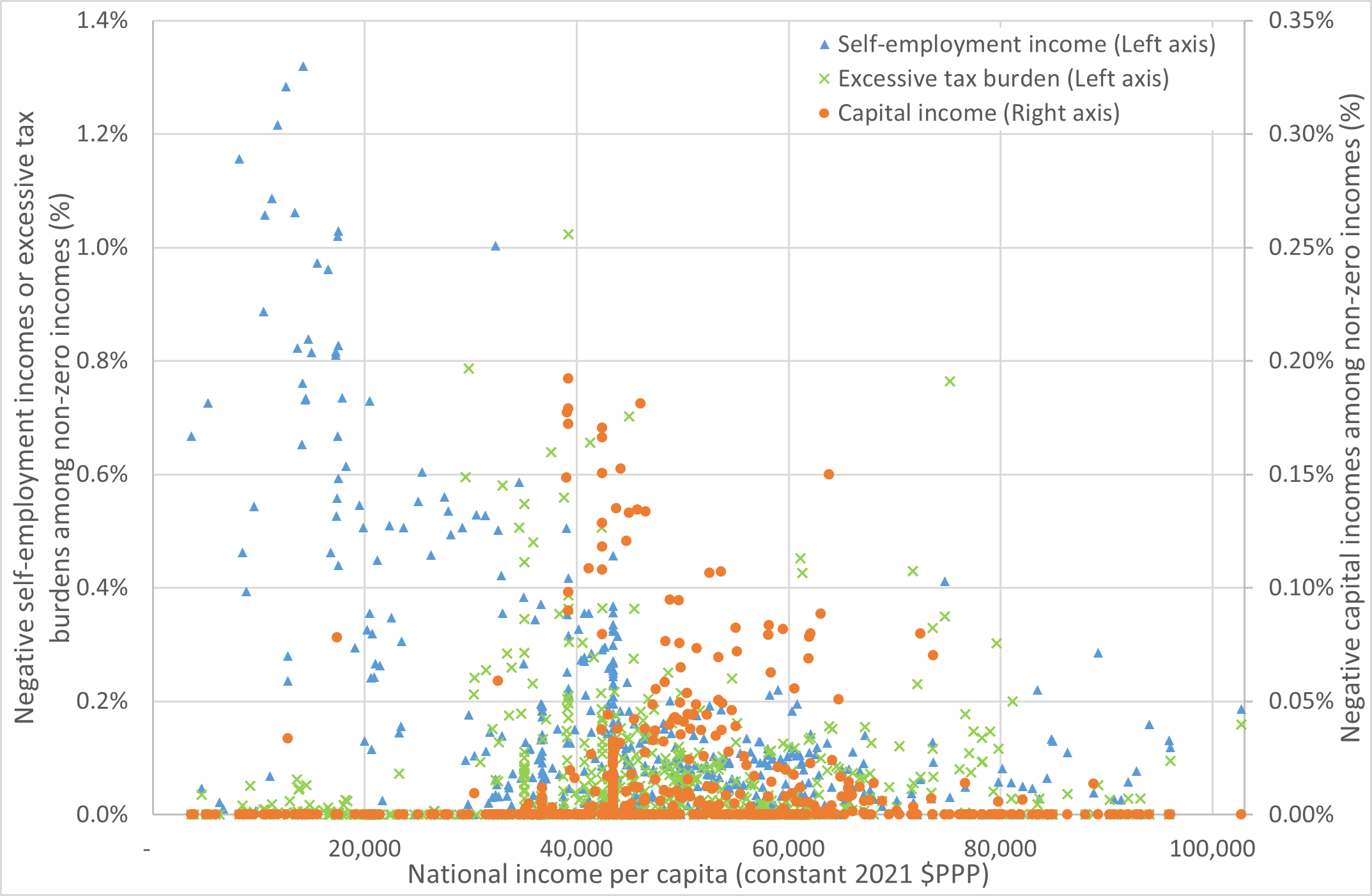 Figure 1. Negative self-employment incomes, negative capital incomes and excessive tax burden among non-zero incomes, by national income level (%)