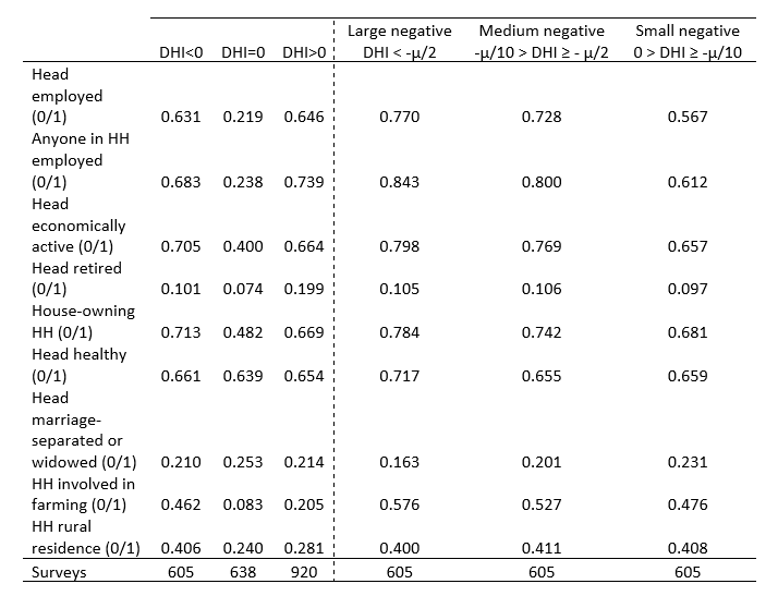 Are households with non-positive incomes poor or socially disadvantaged? Looking at some indicators of households’ contemporaneous and longer-term socio-economic position – including consumption, labor market status, health, education, marital status, homeownership and urban/rural residence – we conclude that households with negative incomes share similar characteristics with other households in terms of material wellbeing and social status. Table 1 confirms this for binary socio-economic indicators – the prevalence of desirable characteristics is as high among negative-income households as among positive-income households (or even higher). In fact, the lower the negative disposable income, the higher the share of households with better socio-economic status: This applies to household heads’ health, employment status, marital status and homeownership. By contrast, zero-income households appear to be presently materially deprived in terms of consumption, employment status and homeownership, even though their human capabilities as manifested by their health, education and residence near urban markets are not clearly worse than their peers’ (Table 1). Perhaps surprisingly, zero-income households are less likely to be engaged in farming, and less likely to reside in rural areas.