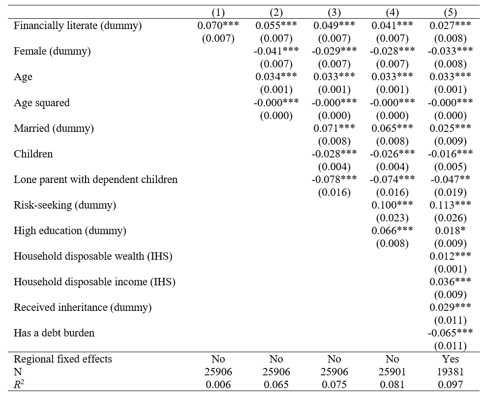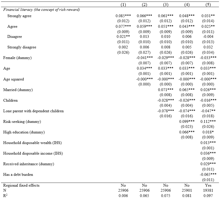 FLi is a dummy variable that indicates whether an individual is financially literate or not. Given the limitations of the available data and unlike in the previous studies considering the financial literacy score (e.g., Lusardi and Mitchell, 2014), our variable is only constructed based on the question related to the concept of risk-reward. The precise question is the following “You can’t expect to get a good return on your money if you don’t take certain risks?” with 4 options: “strongly disagree”, “disagree”, “neither agree nor disagree”, “agree”, “strongly agree”. The dummy variable takes a value of 1 if an individual answers either “agree” or “strongly agree” and 0 otherwise. Following the prior household finance research, Xi represents a vector of socio-demographic and economic factors such as gender, marital status, employment status, income, etc., and δ is a set of dummy variables capturing regional fixed effects. More detailed description of further variables considered in the analysis is available in Table A1.
