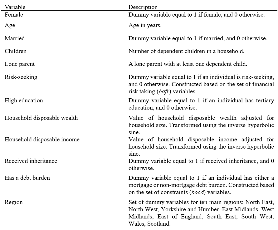 For the purposes of the analysis, we employ cross-sectional data for the United Kingdom in 2019 accessed via LWS. The data has detailed information on both the asset side and liability side of household portfolio which allows to conduct detailed examination of the determinants of voluntary savings. In addition, the data contains a wide range of socio-demographic characteristics and financial attitudes of individuals. Importantly, the survey data contains a question about the awareness of the concept of risk-reward, which we use as a proxy for financial literacy.