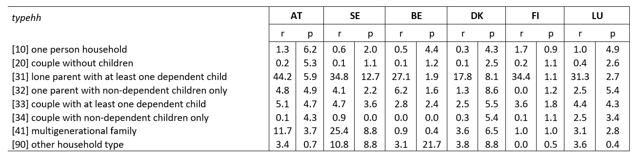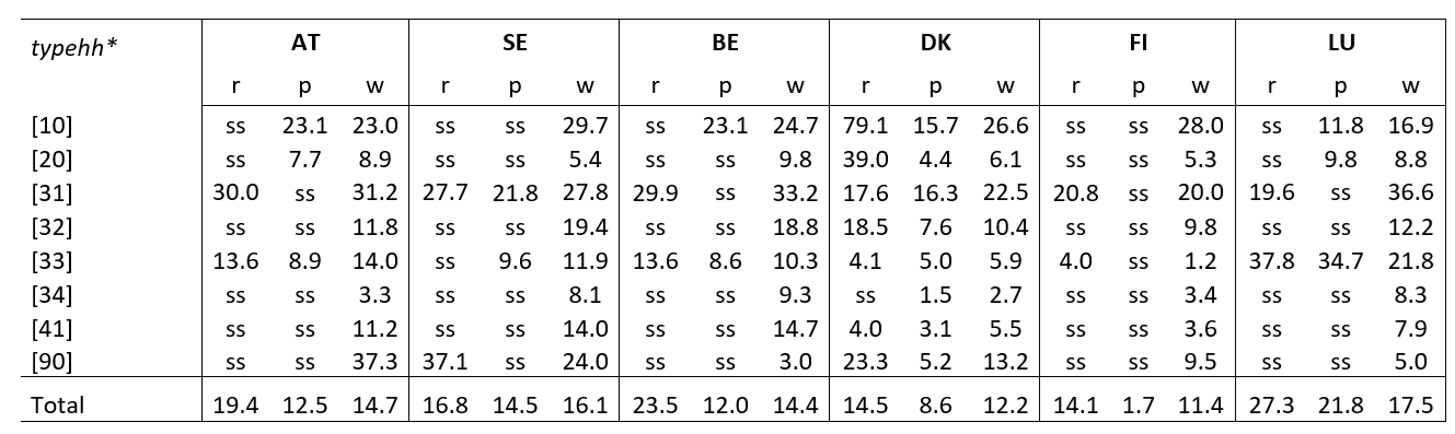 Note: * typehh includes: [10] one person household; [20] couple without children; [31] lone parent with at least one dependent child; [32] lone parent with non-dependent children only; [33] couple with at least one dependent child; [34] couple with non-dependent children only; [41] multigenerational family; [90] other household type.; r for receiving, p for paying; w for the whole population in each household type; ss for low sample size (50 obs or lower)