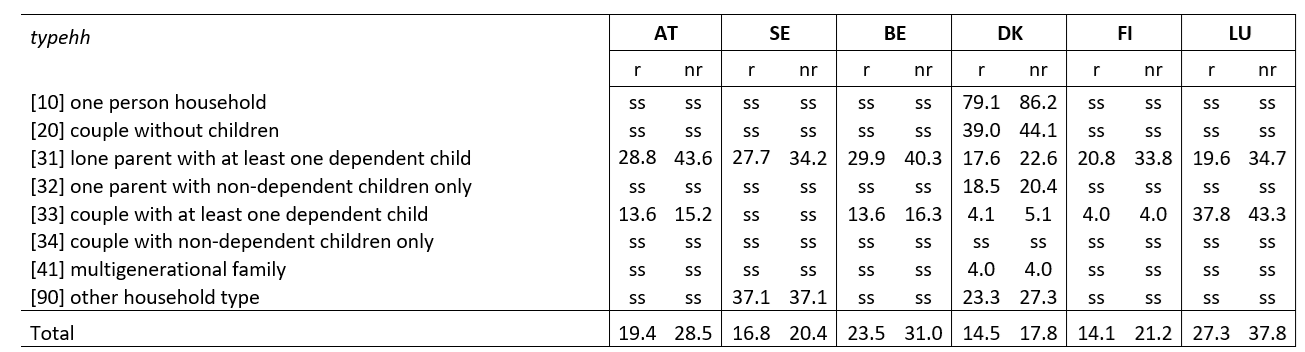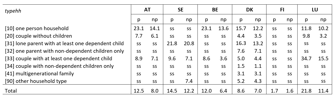 The effect of paying alimony on the poverty rate is reported in Table 3. The impact for the population of payers at the national level is the largest in Luxembourg (about 10 pp) and ranges between 2 pp and 5 pp in the other countries (no effect in Finland). Depending on the country, the sample is large enough to report results only for a few household types ([10], [20], [31], and [33]). In Finland, the sample of alimony payers is too small to show any results by household type.