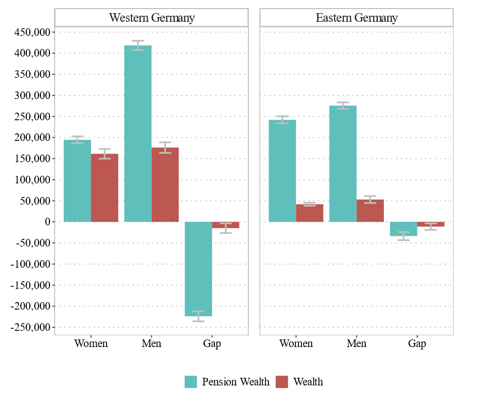 Using data from the 2017 wave of the German Socio-Economic Panel, we analyse pension wealth—the discounted value of public and occupational pensions over individuals’ remaining life expectancy—and personal net wealth, defined as individually owned assets minus liabilities, with jointly held items allocated by reported shares. The results reveal marked gendered inequalities within couples, which differ substantially between Eastern and Western Germany.