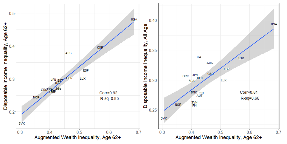 Figure 2. Augmented wealth inequality in old age versus disposable income inequality in old age (left) and versus disposable income inequality in the total population (right)
